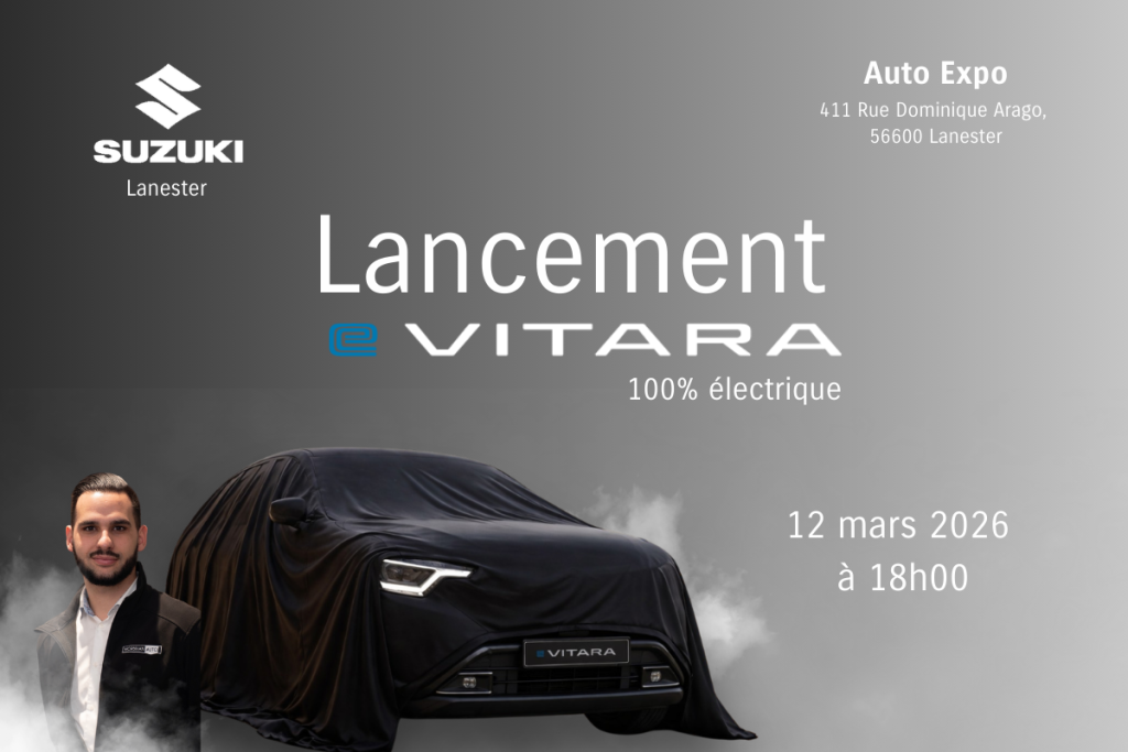 Participez au lancement exclusif du nouveau Suzuki e‑Vitara !  Le 12 mars à 18h00 chez Suzuki Lanester Soyez parmi les premiers à découvrir le tout premier SUV 100% électrique de Suzuki. Un événement unique, en présence d’Arthur, Chef de Groupe, qui vous dévoilera toutes les innovations de ce modèle révolutionnaire. Le nouveau Suzuki e‑Vitara arrive […]