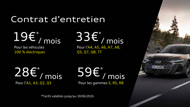 Le contrat d’entretien Audi permet de maîtriser le coût de l’entretien de votre véhicule, en regroupant les opérations prévues par le constructeur dans un forfait mensuel.